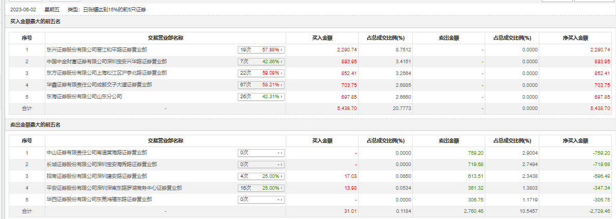 具体来看,东兴证券晋江和平路证券营业部、中国中金财富证券有限公司深圳宝安兴华路证券营业部分别买入2290.74万元、893.95万元;中山证券南通黄海路证券营业部、长城证券深圳宝安海秀路证券营业部分别卖出759.20万元、719.68万元。