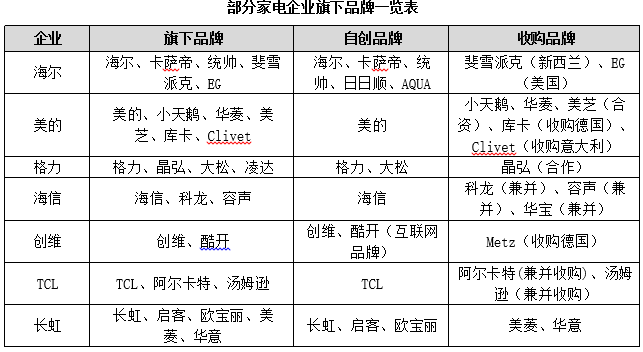 比如说,海尔旗下有海尔、卡萨帝、统帅、斐雪派克、GE;美的旗下有美的、小天鹅、华菱、美芝、库卡、Clivet,海信旗下有海信、科龙、容声,格力旗下的格力、晶弘、大松等。几乎每个家电品牌都会有旗下的子品牌。(附表,部分家电企业旗下品牌一览)