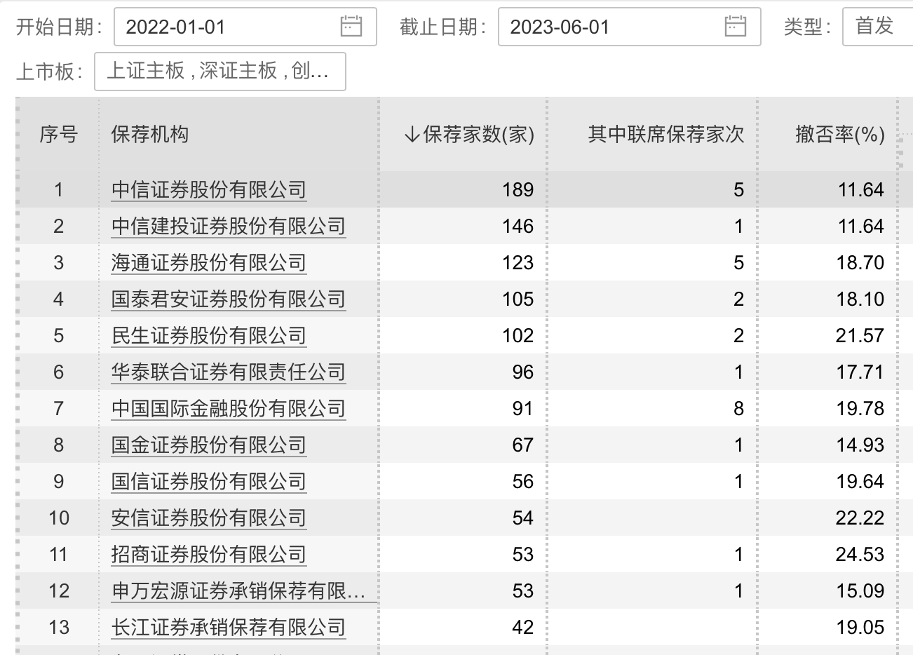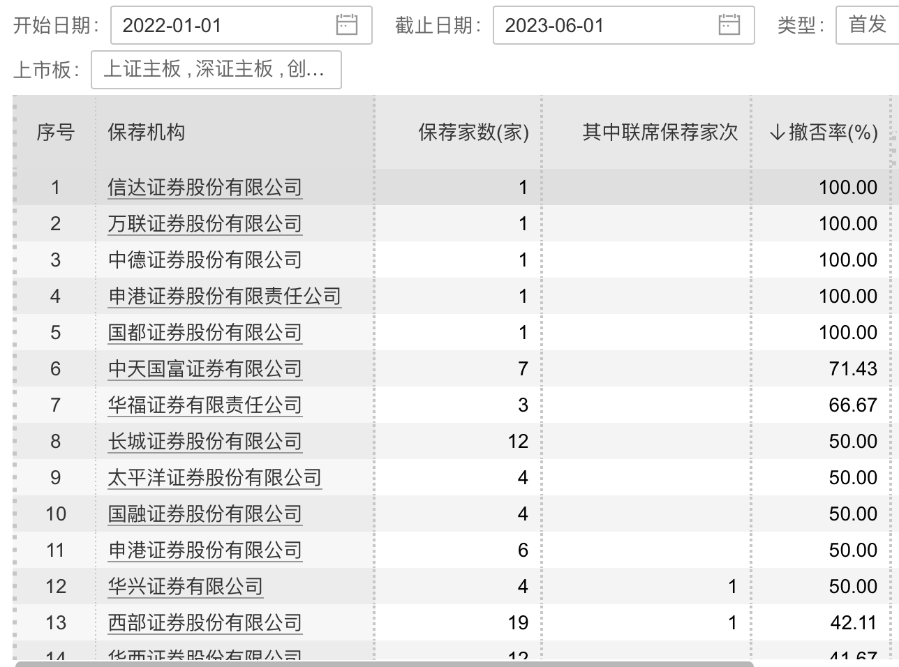 根据Wind数据,2022年1月1日至2023年6月1日,只看首发的话,沪深京三市保荐家数排名前五券商为中信证券、中信建投、海通证券、国泰君安、民生证券,保荐家数分别为189家、146家、123家、105家、102家,撤否率分别为11.64%、11.64%、18.7%、18.7%、21.57%。如果看撤否率排名的话,信达证券、万联证券、中德证券、申港证券、国都证券均是仅保荐了1家,就主动撤回了,撤否率100%。如果只看保荐家数超50家的券商,那招商证券共保荐53家,却以22.22%的撤否率排在前列。紧随其后的是安信证券,保荐家数54家,撤否率22.22%;民生证券保荐家数102家,撤否率21.57%。中金公司、国新证券等撤否率也都在19%以上。