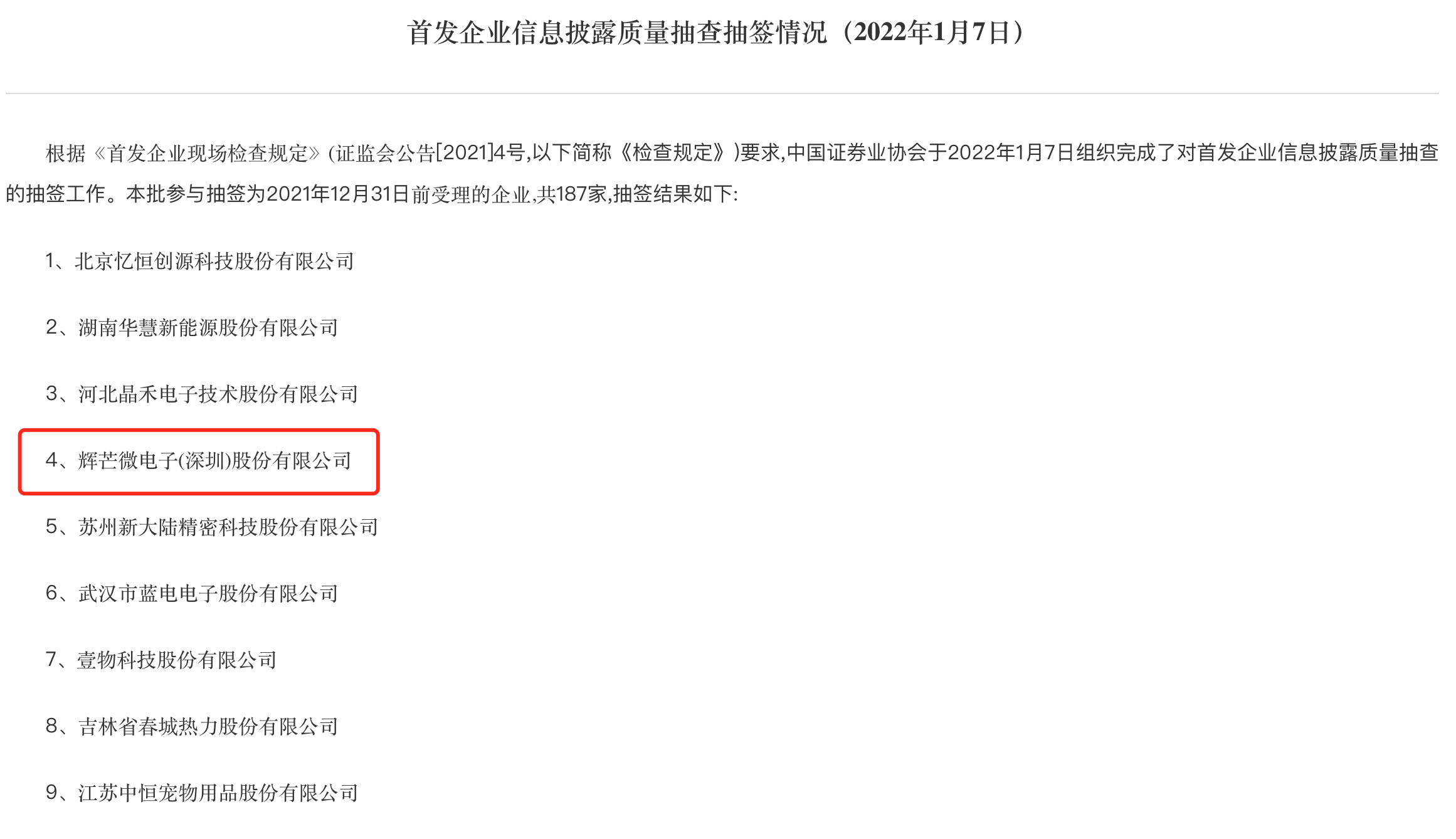 更进一步看,辉芒微正好在2022年第一批首发企业信息披露质量抽查抽检的公司名单当中,中国证券业协会于2022年1月7日组织完成了对首发企业信息披露质量抽查的抽签工作,当时共计187家参与抽签,9家抽中。