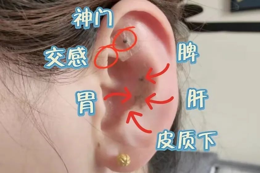 1.选取穴位后,用75%酒精对耳廓皮肤进行消毒脱脂,用0.6x0.6era胶布将一粒王不留行籽古定于所选穴位上。
