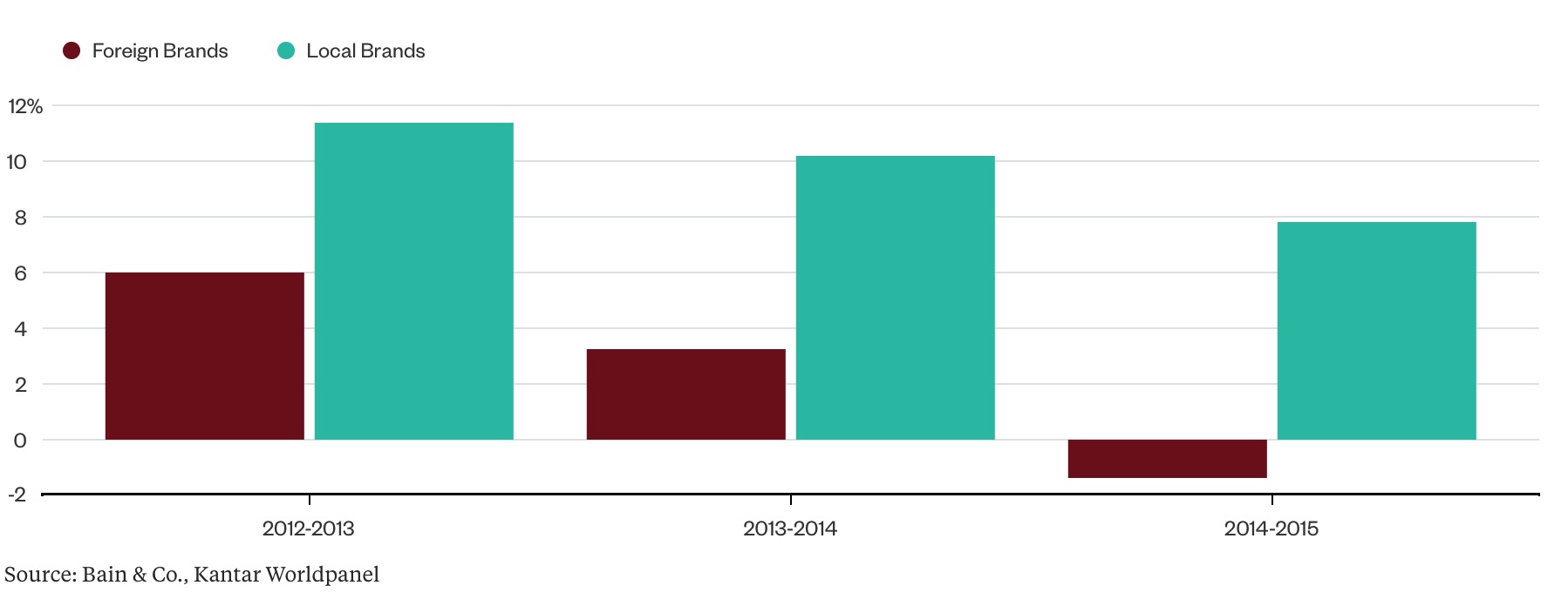 彭博社援引贝恩公司(Bain & Co.)最近发布的一份快消品行业研究报告称,在中国经济减速对消费构成压力之际,外企比中国本土企业的表现更糟。数据显示,从洗发水到啤酒的26类消费品中,国际品牌去年销量下降1.4%,而通常对消费者口味变化反应更快的本土品牌销量上升了7.8%。