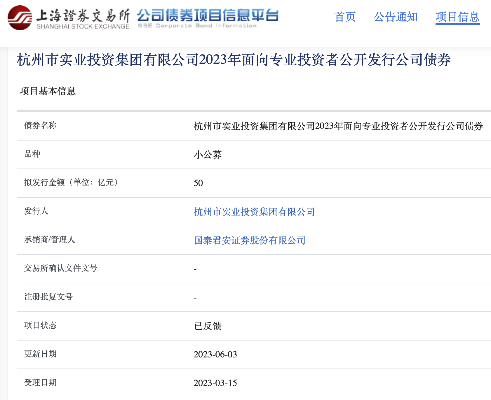 上交所公司债券项目信息平台显示,杭州市实业投资集团有限公司50亿元小公募债项目状态更新为“已反馈”,更新日期为2023年6月3日。根据募集说明书反馈回复稿,本次债券注册总额不超过50.00亿元(含50.00亿元),采取分期发行。综合考虑公司实际资金需求及未来资金安排计划,本次发行的公司债券募集资金在扣除必要的发行费用后,拟将不少于20亿元用于直接投资或采用基金形式投资科创类企业,不少于20亿元用于偿还公司债务,剩余的用于补充流动资金。