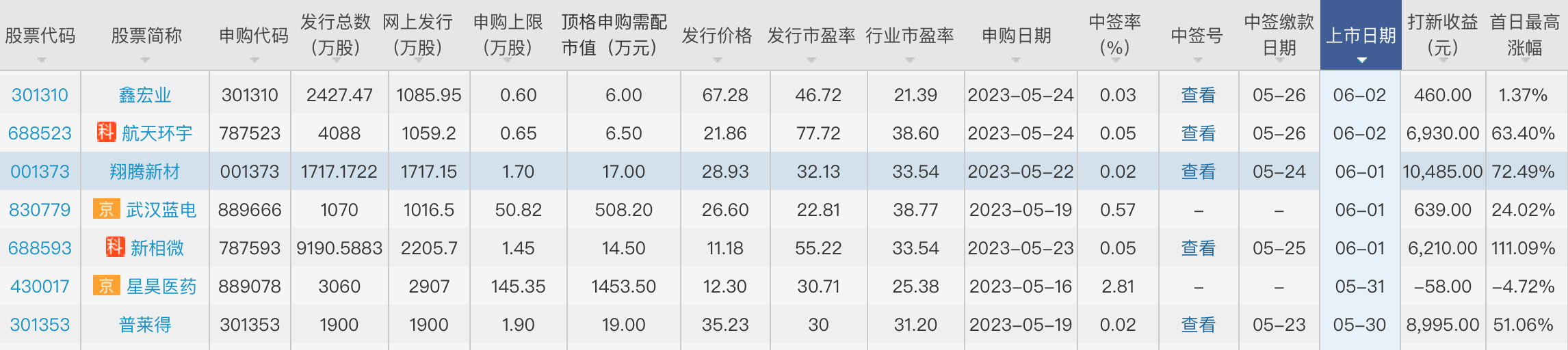上周共有7只新股登陆A股,除了星昊医药(430017.BJ)之外,其余新股的打新收益均为正值。其中的翔腾新材(001373.SZ)表现最抢眼,该公司发行价格为28.93元,上市首日股价最高49.9元。不止如此,翔腾新材上市第二天,也即是6月2日,股价最高冲到了68.88元,若中签者仍然持有的话,账面最高收益已接近2万。截至6月2日收盘时,翔腾新材的收盘价61.94元。