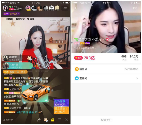 这个少女不太冷是陌陌直播排名第一的女主播,粉丝们更习惯称呼这个92年的姑娘为“阿冷”。从今年3月注册陌陌至今,阿冷已经赚到了28.3亿星光值,按照星光值和人民币100:1的兑换比例,这位90后少女用大半年的时间吸金2800万元——这个数字甚至比杨幂2015年全年收入都要高(2700万元,《2015福布斯中国名人榜》)。