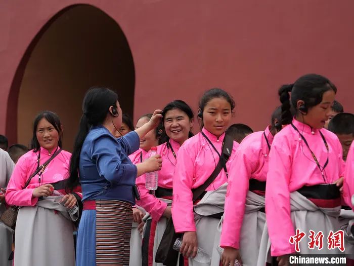 老师白玛拉毛在给索南拉吉(中)整理头发。中新社记者 崔楠 摄