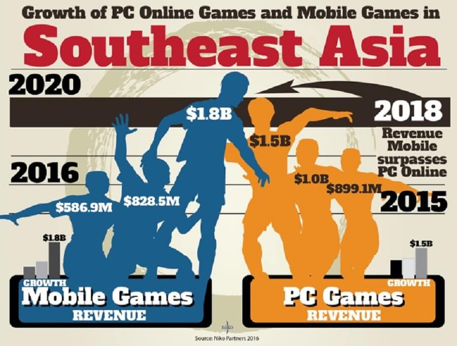 这份124页的报告也预计称,东南亚手机游戏的使用率和收入将在2018年超过PC端游。这份报告讨论了印度尼西亚、马来西亚、菲律宾、新加坡、泰国和越南等东南亚国家的市场情况。