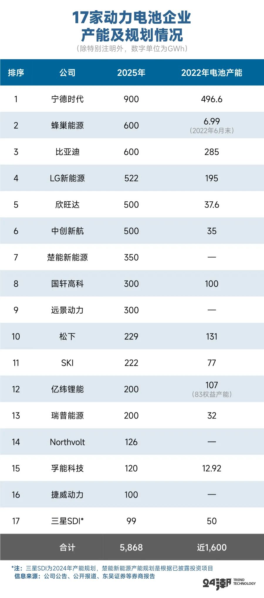 此前24潮团队综合各券商、企业公告等数据发现,仅统计已公开产能规划的全球17家动力电池企业,其在2022年底的产能总计就将近1600GWh,而到2025年的总产能规划更是高达5868GWh!这近乎是2022年全球动力电池总需求量的11.33倍!