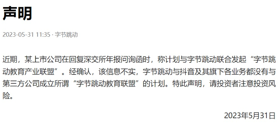 5月24日,*ST豆神回复深交所年报问询函时表示,将与字节跳动联合发起“字节跳动教育产业联盟”。一周之后,字节跳动出面辟谣,发布声明称,字节跳动与抖音及旗下各业务都没有与第三方成立所谓“字节跳动教育联盟”的计划。