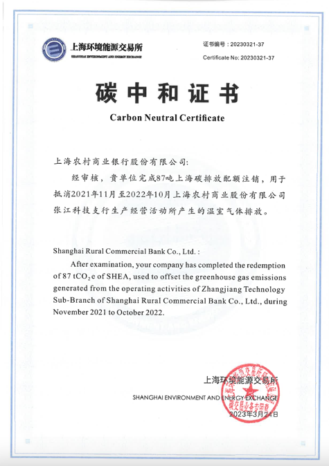 上海农商银行张江科技支行2021年起实现碳中和,成为上海地区首家实现碳中和的银行业营业场所。2022年,张江科技支行进一步挖掘节能潜力,提升设备运行效率,促进节能减排措施有效落实。2021年11月至2022年10月,张江科技支行碳排放量为86.05吨,较2020年11月至2021年10月下降44%。