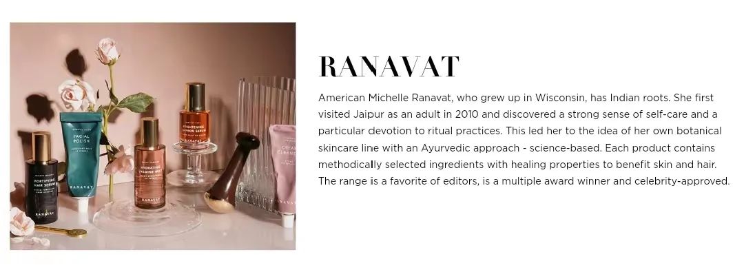据悉,“阿育吠陀”源于古印度,核心是推崇自然,维持身心平衡的健康和美。常见方法是通过传统药草、推拿、瑜伽和油浴等方法进行,但经过现代化改造,“阿育吠陀”如今主推精油类产品,并孕育出了The Ayurveda Experience等大受欢迎的本土护肤品牌,国外品牌如丝芙兰,也在22年上线了首个“阿育吠陀”护肤品牌——Ranavat。