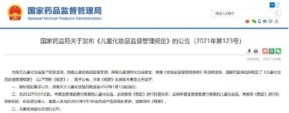 2021年10月8日,《儿童化妆品监督管理规定》正式发布,这是我国首个专门针对儿童化妆品的监管法规文件,共22条,内容涉及儿童化妆品的定义、标签要求、配方设计原则、安全评估、生产经营要求等。