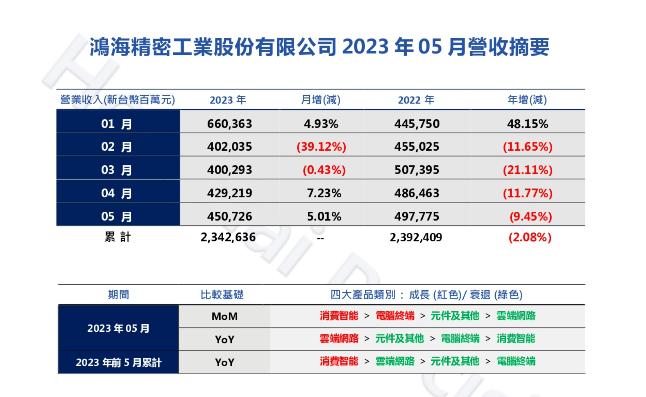6月5日,鸿海公布5月销售额4507.26亿元新台币,环比增加5.01%,同比减少9.45%。鸿海表示,基于目前已经进入新旧产品转换期,加上2021年缺料状况在去年上半年缓解,致使去年上半年拉货动能高于一般季节性表现,在去年基期较高的情况下,维持4月份释出的第二季展望,预估2023年第二季营运展望将呈现季减、年减的状态。