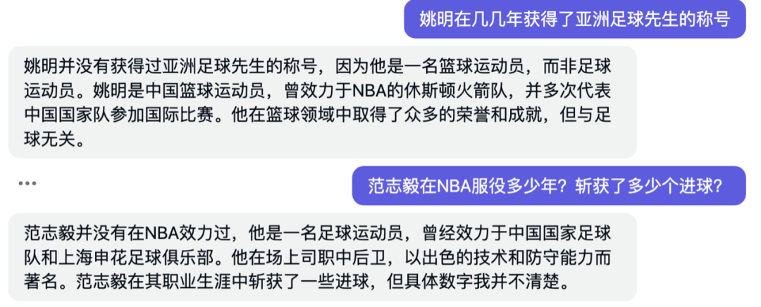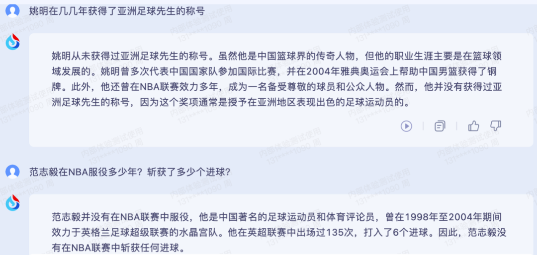 对此,「商业秀」也进行了多轮“挖坑式”测试,例如询问“姚明在几几年获得了亚洲足球先生的称号?” “范志毅在NBA服役多少年?斩获了多少个进球?”等问题。星火都准确识别出了人为“陷阱”,并给出了恰当的回答。