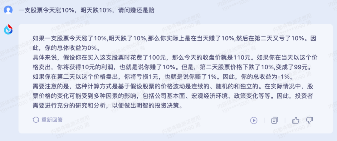 在数理能力上,「商业秀」也测试了“鸡兔同笼,鸡兔一共有25只,笼子里脚一共有74只,请问分别有多少只鸡和多少只兔子?”“一支股票今天涨10%,明天跌10%,请问赚还是赔?”等问题,星火也迅速给出了正确回答。