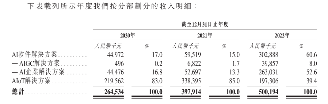 直到2022年,AI软件解决方案才成为主要收入来源,其中,面向B端的AI企业解决方案收入2.6亿,同比增长396%。