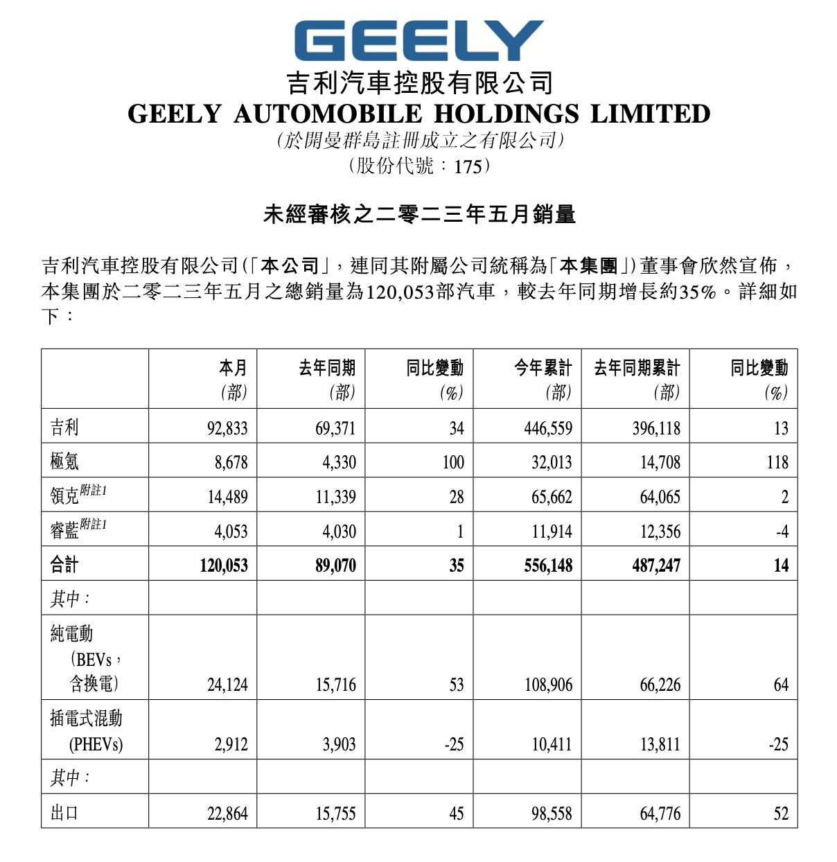 6月5日,吉利汽车公告,5月汽车销量12.01万辆,同比增长35%。纯电动汽车销量2.41万辆,同比增长53%。