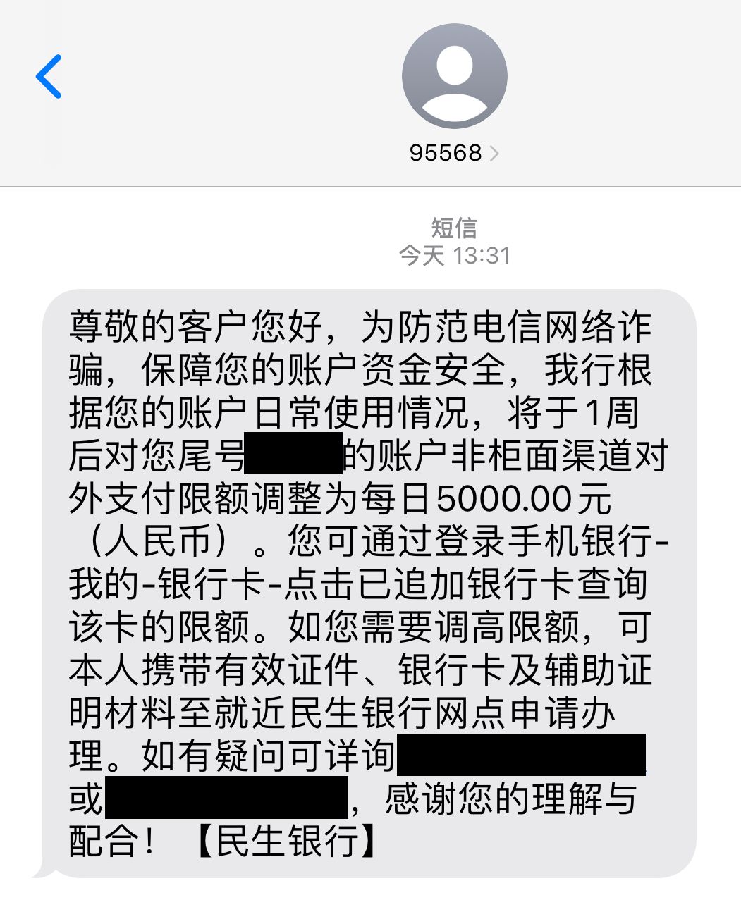 根据央行要求,银行应当设立个人账户管理体系,根据客户的身份、职业、年龄、交易特征,合理设置非柜面业务单一资金转出的总限额。这种“限额”也并非“一刀切”,如果对交易造成不便,是可以去银行申请调整的。从受访者提供的短信截图来看,如果想要调整限额,需持身份证和银行卡到银行网点办理。