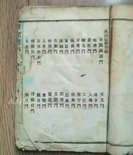 这本晚清的英语课本开篇“英话注释目录”后标注着,“地理门”、“君臣门”、“师友门”、“宫署门”、“五金门”等门类。