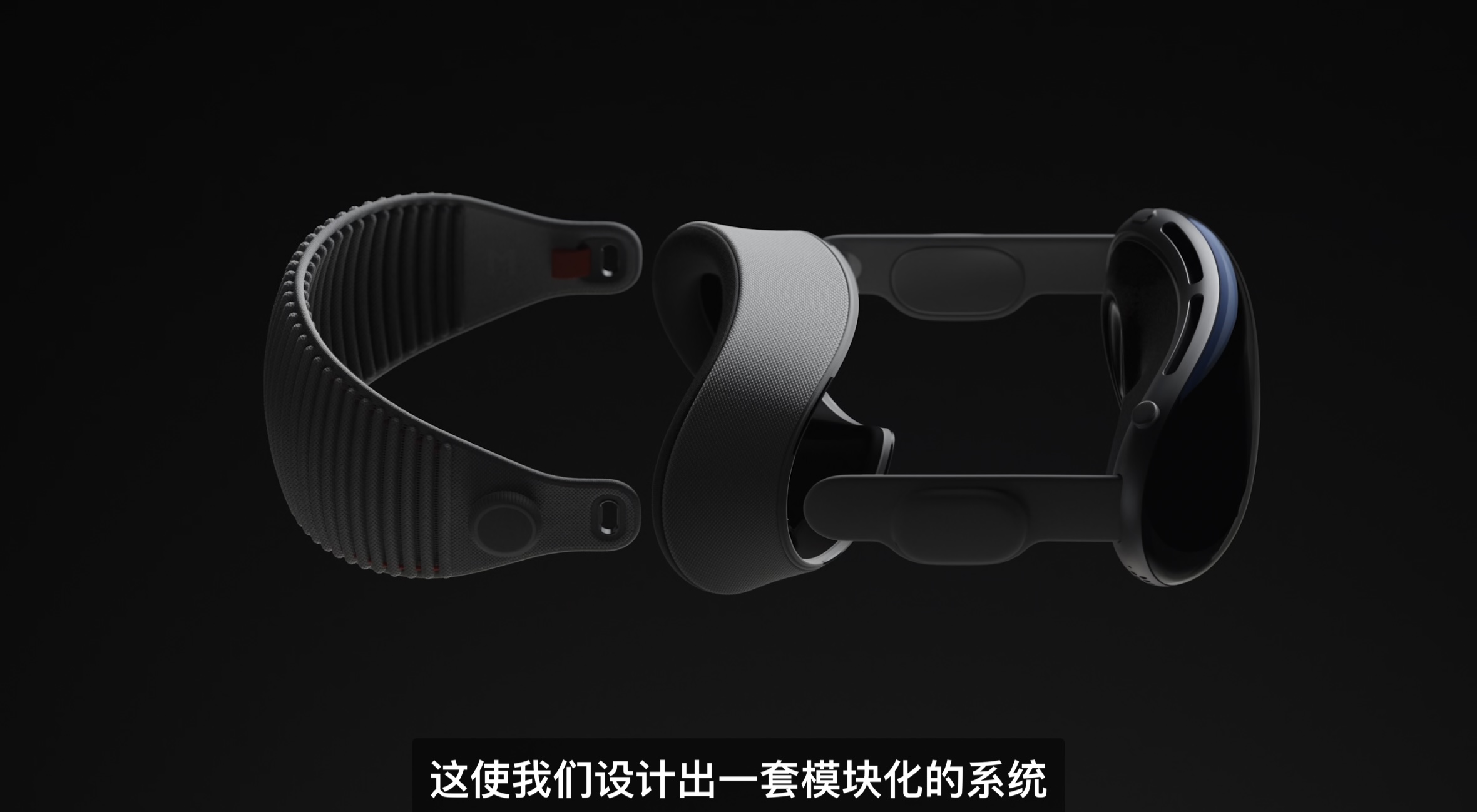再看设计和硬件配置。为实现性能、移动和可穿戴方面的综合考虑,Apple Vision Pro需要采用尽可能轻量和先进的材质及技术。其外框采用特制铝合金,正面采用了一整块以三维方式构造的层压玻璃,包裹头部的部分以相对柔软的织物为主,并已经形成一套可拆卸、模块化的系统,拥有不同形状和尺寸的眼罩以适应不同人群。产品含有一个用于拍照摄影的按钮,和一个用于点按调出主视图的数码旋钮,其旋转时可调节空间环境的沉浸度。