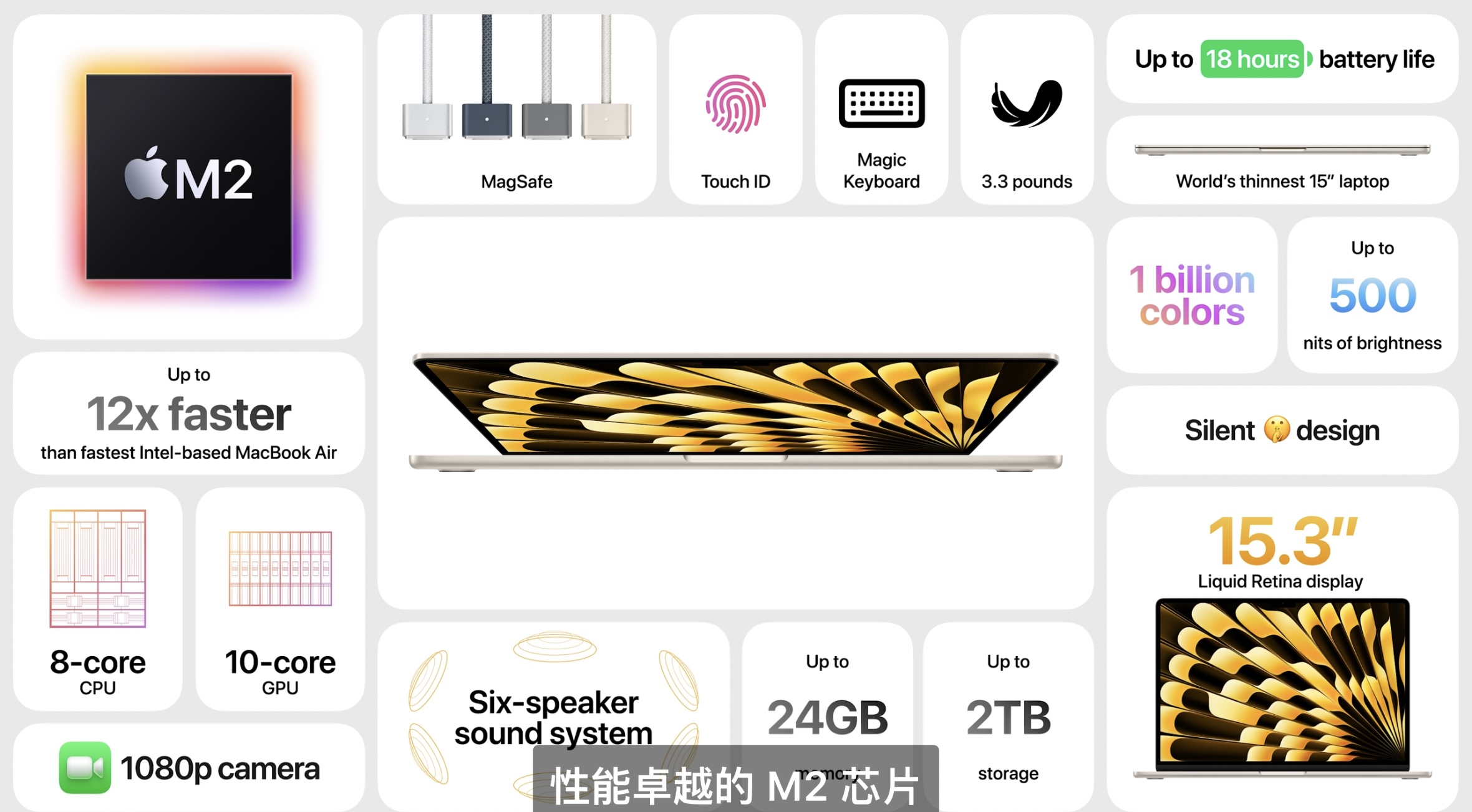 15英寸的MacBook Air如约而至。正如传闻所说,其外观没有太大改变,厚度11.5毫米,重约3磅,共有四款颜色。硬件配置上搭载M2芯片,相较于采用英特尔芯片的MacBook Air,其性能提升12倍。此外,其续航时间达18小时。