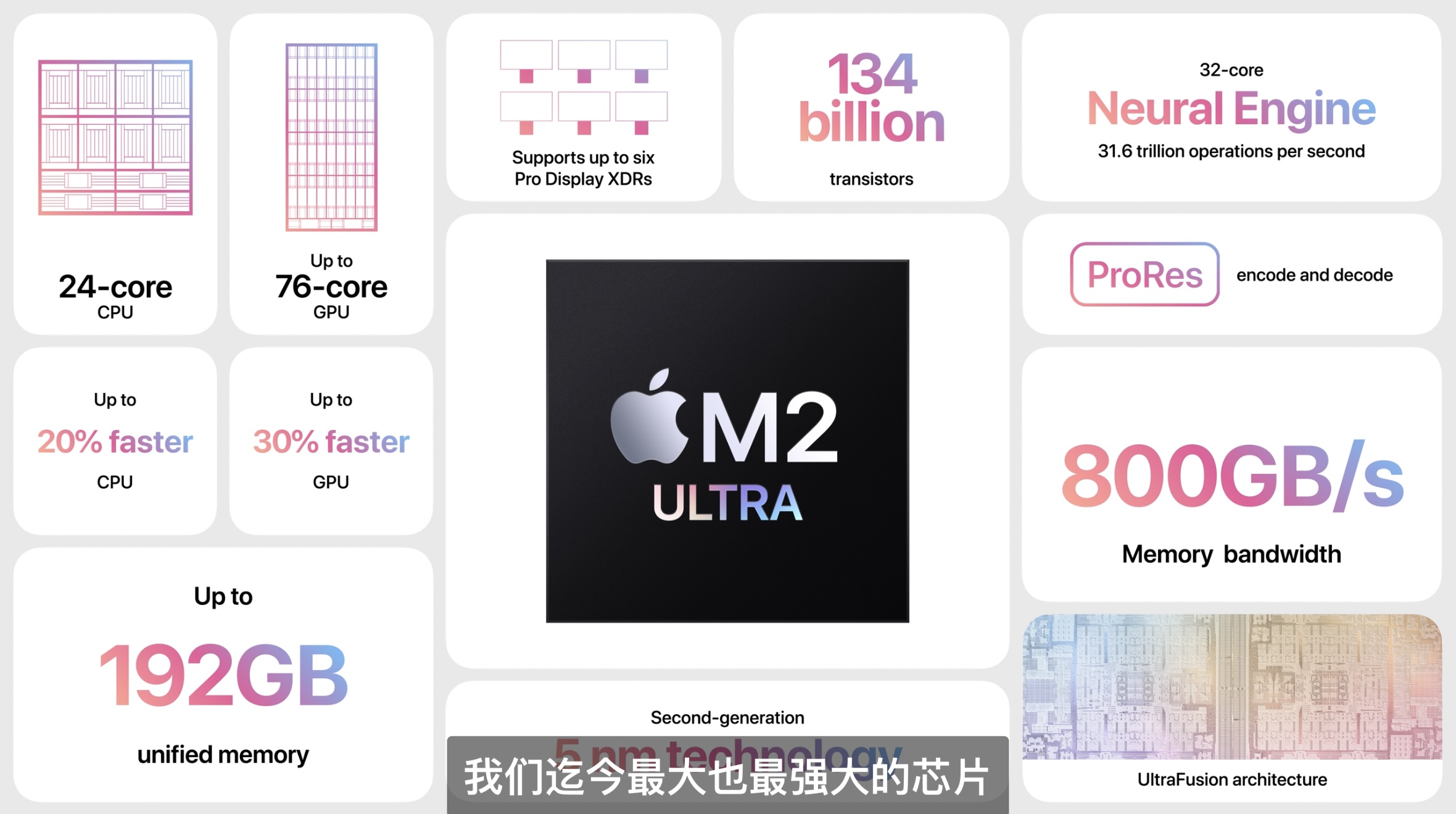 另一项相对重磅的更新是苹果M2系列芯片的最后一位成员,M2 Ultra。此前,M2 Max拥有12核CPU和30核GPU,支持高达96GB的内存,M2 Ultra将使所有这些规格翻倍,新芯片将配备24核CPU、60核GPU(高达76核)和高达192GB的内存。