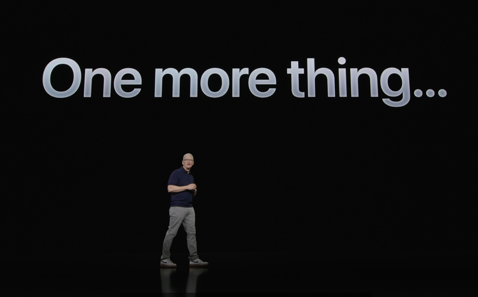 发布会开始的前80分钟,苹果的内容节奏相当紧凑。而直到镜头再次转回漆黑的剧场,库克在舞台上一边踱步一边说着新的内容,背景适时地切换到那个令人激动的彩蛋字幕:One more thing。
