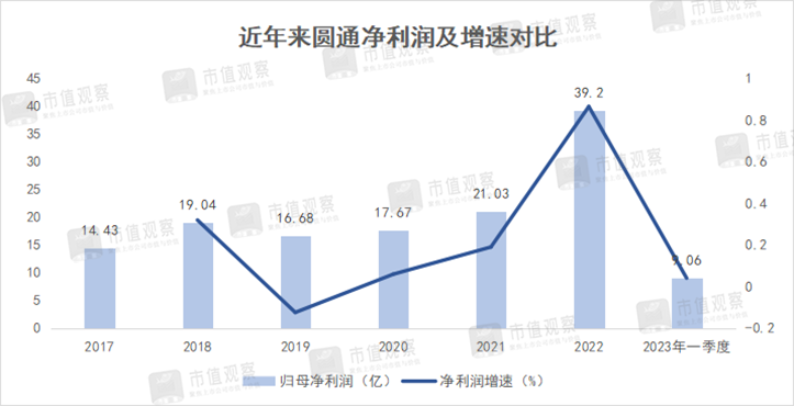 但在接下来的2023年一季度,圆通并没有延续此前的高增长,营收和净利润增速大幅放缓。一季度营收129.14亿,同比增长9.19%;净利润9.06亿,仅增长了4.08%,在主要快递企业中仅高于韵达。