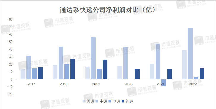 对比2022年通达系巨头净利润,圆通达39.2亿,已经领先韵达申通几个身位。