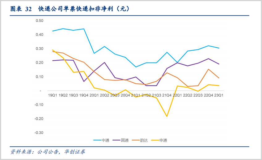 据华创证券研究,一季度通达系只有圆通的单票扣非净利是下降趋势,为0.2元,同比下降了10%,其他巨头则持平或上涨。
