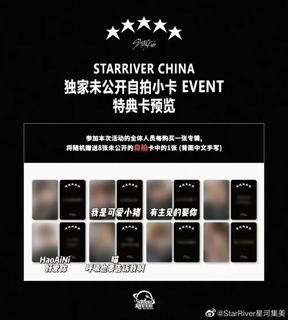 特典卡则是指平台和偶像公司联合推出的平台限定。譬如近期正在专辑预售期的Stray Kids,目前已公布的平台特典卡超过20种,于近期回归的宋雨琦所在组合G-idle,和购物平台KMStation合作的特典卡,已经出了三个版本。
