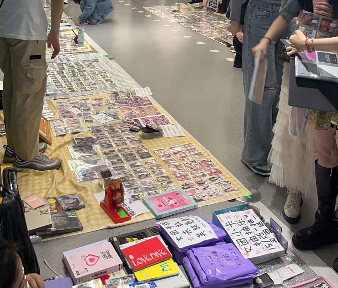 五一期间,白白就跟朋友一起参与了一场线下小卡摆摊。5月2日,白白和朋友在小红书刷到嘻番里摆摊集市的宣传,便准备好卡册、手写看板、野餐垫和小板凳,远赴海淀。白白到达现场时,集市的地板上已经铺满了摊主们的卡册,“人真的很多,都赶得上周五的三里屯了。”