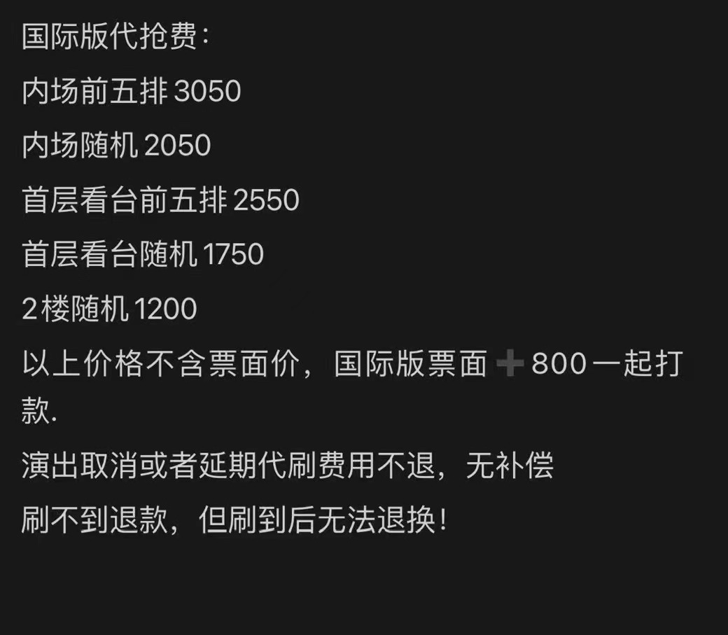 5月24日,韩国男团seventeen官宣首尔演唱会后,粉丝朝朝就在朋友圈看见了黄牛和代拍们给出的价格参考。据了解,该场演唱会普通票价格折合人民币约820元,VIP票约1054元,而票务给出内场前五排的代抢费最高超过3000元,二层看台的也达到了千元。但朝朝仍然快速地在抢票平台interpark注册了账号,并和代购约定了抢票事宜。
