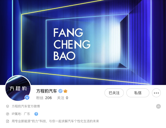 6月6日,一个名为“方程豹汽车”的认证微博现身,IP属地为广东,据推测,“方程豹”即为比亚迪计划年内推出的“F品牌”的正式命名。深圳市比亚迪汽车研发公司于5月底发生工商变更,企业名称变更为深圳方程豹汽车销售有限公司。彼时外界就猜测,F品牌或命名为“方程豹”。目前该微博尚未发布任何消息,预计很快将官宣。