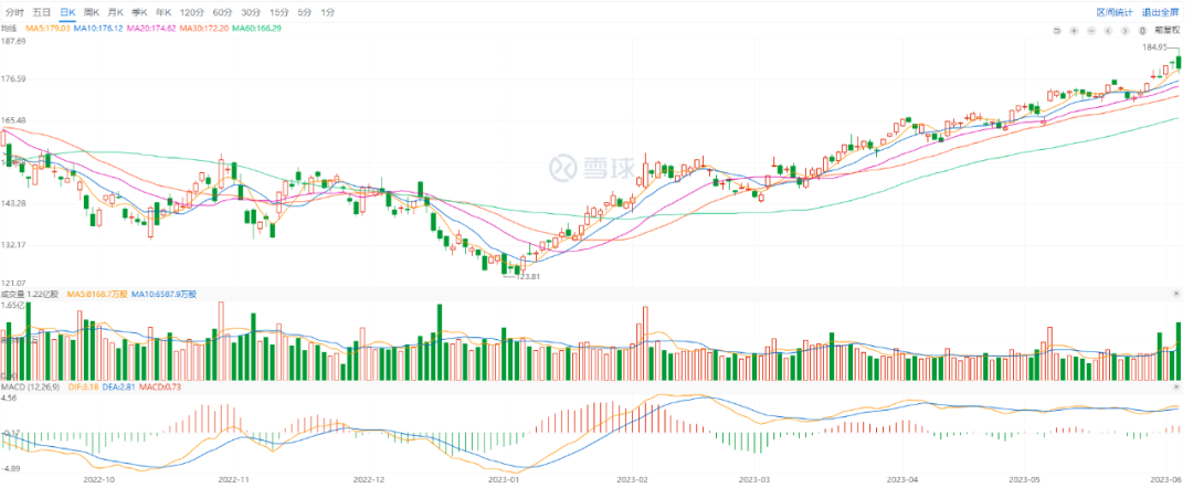 在公告发布前,苹果股价上涨超过2%至184.91 美元/股,创下苹果股价最近几个月以来的新高。但当Vision Pro正式亮相后,苹果股价则迅速开始回落。