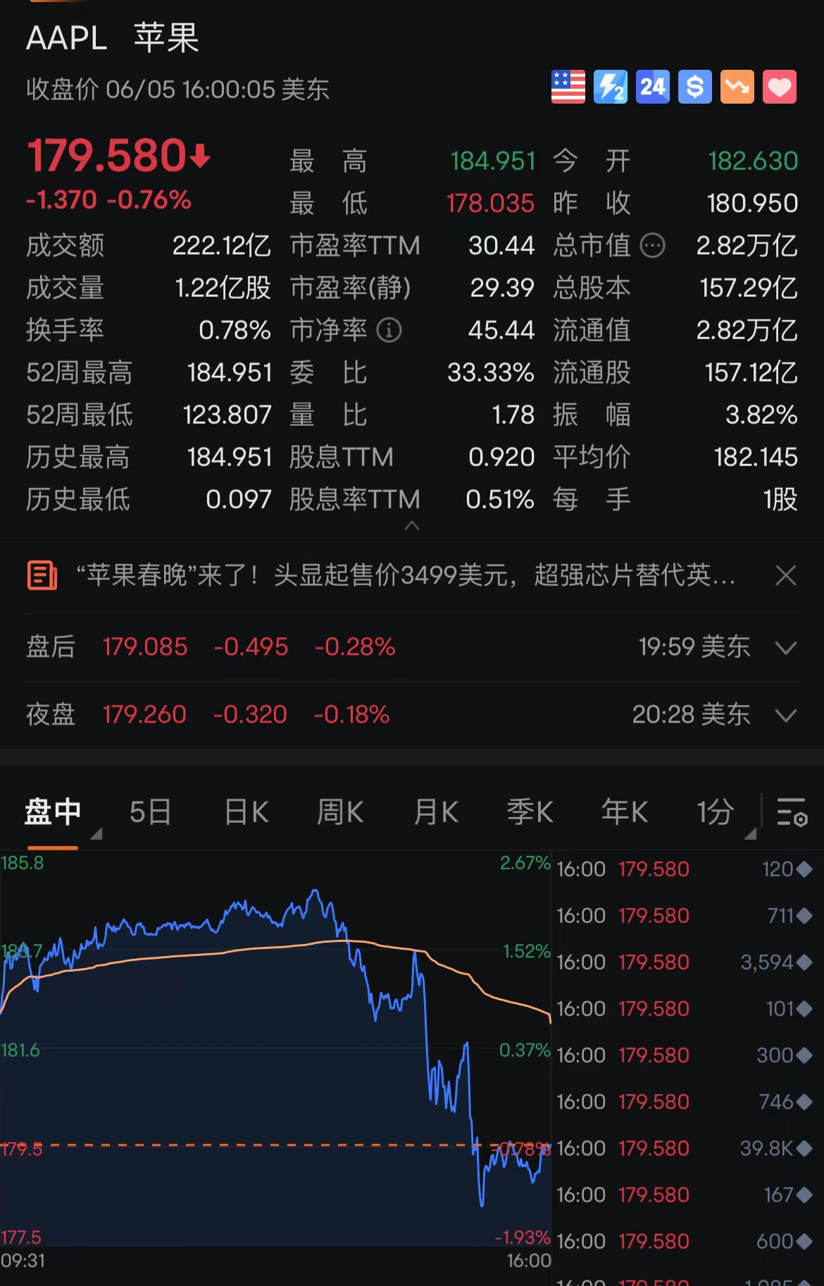 今年3月,苹果将发布MR头显的消息传出后,苹果股价一路走高。当地时间6月5日,苹果开盘后股价上扬,盘中一度上涨2%,高点超184美元/股,创历史高点,但苹果开始发布MR头显后,苹果股价走低,最终收跌0.76%。