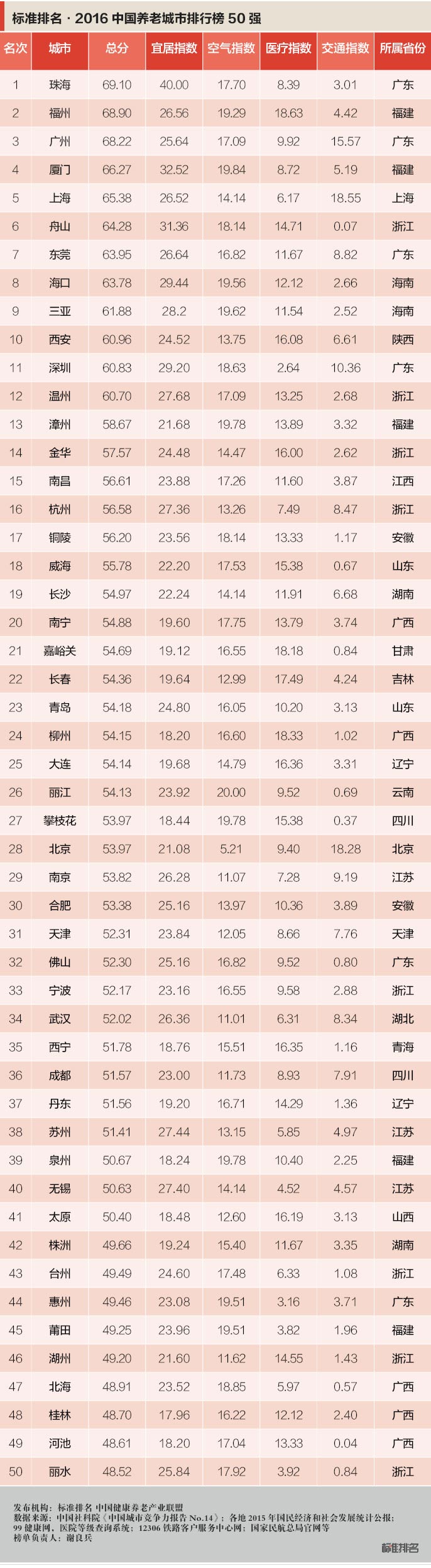 根据“标准排名·2016中国养老城市排行榜50强”显示,广东珠海、福建福州、广东广州、福建厦门、上海、浙江舟山、广东东莞、海南海口、海南三亚、陕西西安脱颖而出,成为“2016中国大陆十佳养老城市”。其中,西安入围十强令人意外。