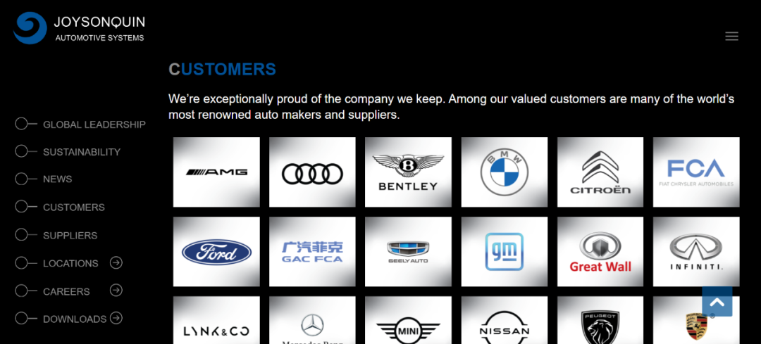 「探客出行」从均胜群英的官网发现,上至宾利、保时捷和BBA这种豪华品牌,下至长城、吉利和丰田等入门家用品牌,累计20余家汽车厂商都是均胜群英的合作客户。