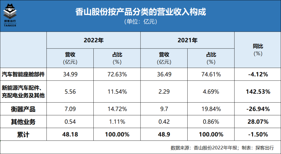 「探客出行」从2022年报发现,按照产品分类香山股份营业收入是由智能座舱、充配电和衡器三大业务构成。