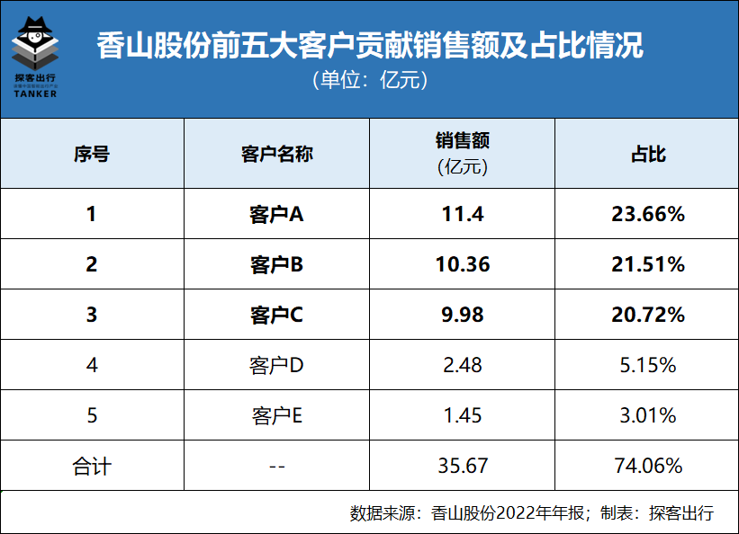 「探客出行」从香山股份2022年报获悉,香山股份的前五大客户累计销售额约35.67亿元,占全年总营收的74.06%。尤其是前三大客户直接贡献了31.74亿元的营收,占总营收的65.89%。