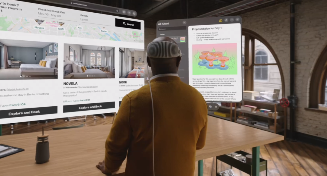 这款酷似滑雪护目镜的产品其实是一个空间计算产品,没有常规的鼠标键盘,而是通过手势、语音、甚至眼球运动进行操控,操控的内容包括Safari、Apple Music和FaceTime等,虚拟世界与现实世界通过Vision Pro实现了融合。苹果也在发布会上尝试着提供了办公、家居和娱乐等应用场景,比如一个男人戴着它给孩子做早饭。