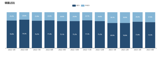 根据乘联会公布的数据来看,从2022年5月开始,直到2023年4月PHEV(混动车型)的销量占比明显在逐渐增多,BEV(纯电车型)的占比从原来接近80%到现在趋于稳定在70%,这都是肉眼可见的变化,证明混动车型在逐渐被市场认可。