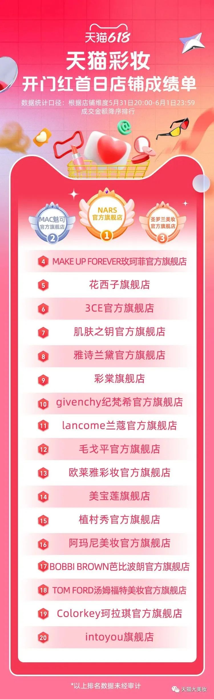 从排行榜中可以看出,大部分席位仍被国外品牌占据,其中NARS以黑马之姿首度入榜,登上TOP1宝座,Mac和YSL分别位列TOP2和TOP3。但在其中,笔者也发现了一些年轻化品牌的身影,例如彩棠、3CE、花西子、INTOYOU等品牌。