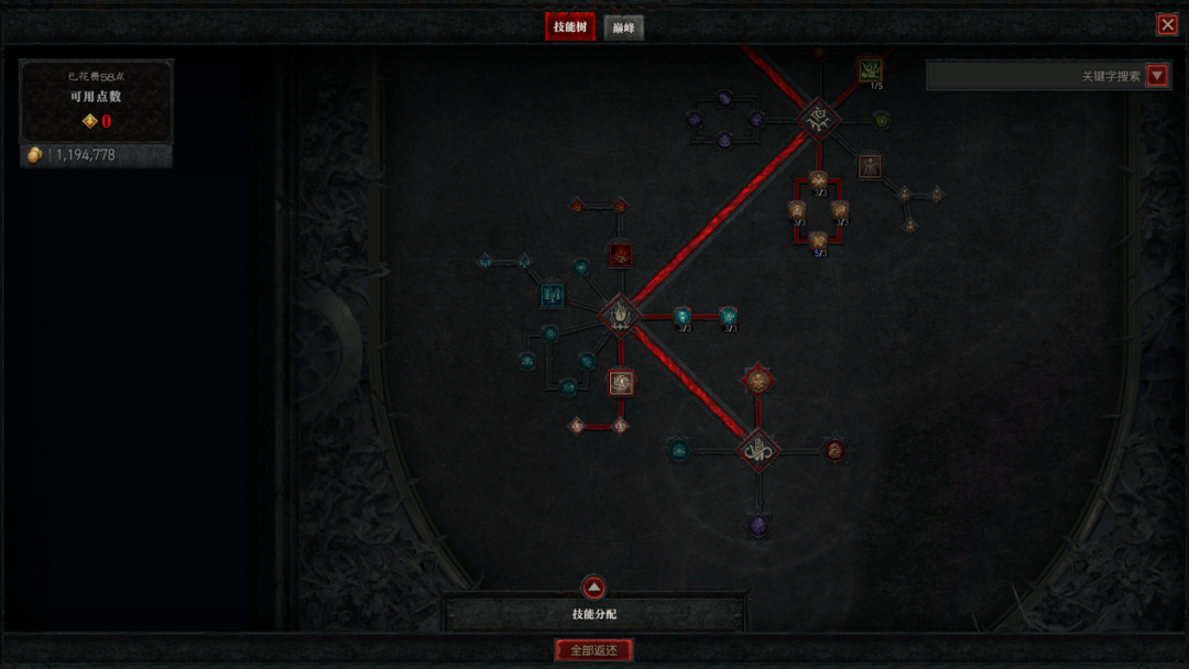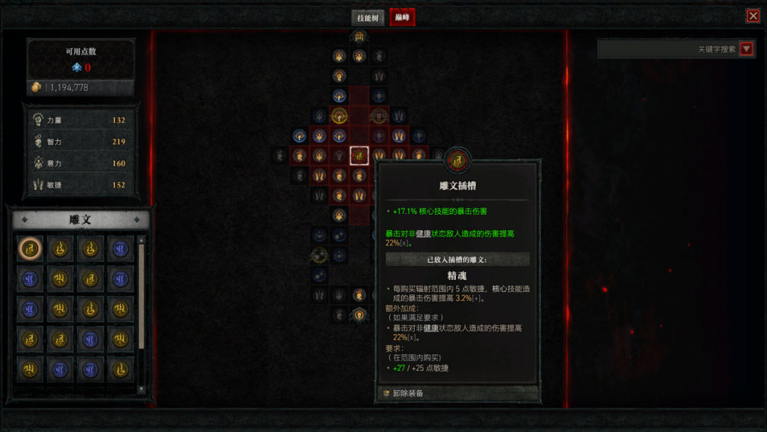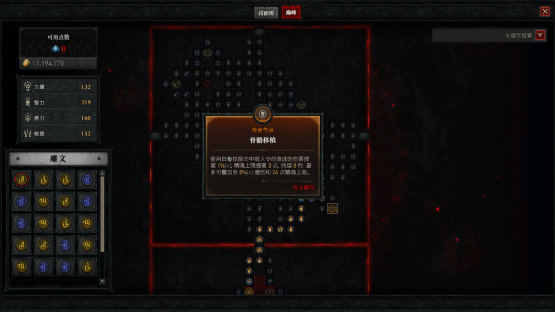 当然,除了这部分可有可无的多人玩法,在满级后巅峰系统是玩家后期养成的重要内容。本作中巅峰系统更有乐趣也更有设计感,玩家50级满级之后就会进入巅峰模式,每次升级都会给4个巅峰点,可以在巅峰面板上获取四个主要属性。除了常规的属性之外,魔法节点和稀有节点还会给与玩家额外的数值加成,最为重要的是新加入的雕文系统取代了前代的传奇宝石,成为了新的肝帝首选。