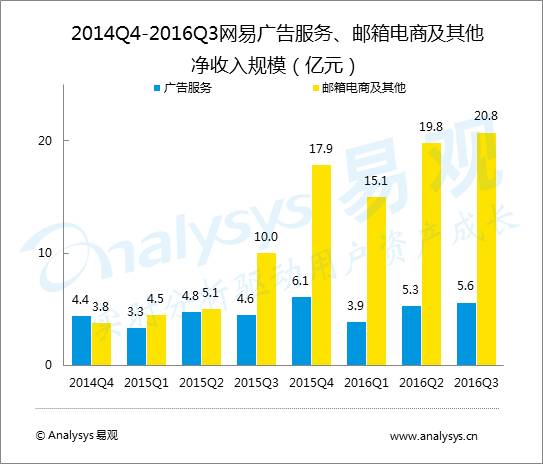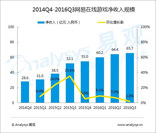 2016年11月10日,网易公布2016年第三季度未经审计财务报表。第三季度,截止9月30日,网易2016年第三季度净收入92.12亿元(13.81亿美元),同比增长38.1%;净利润为27.40亿元(4.11亿美元),同比增长45.6%。其中,在线游戏净收入65.68亿元,同比增长26.0%,广告服务净营收5.63亿元,同比增长23.8%、邮箱电商及其他净收入20.80亿元,同比增长107.2%。