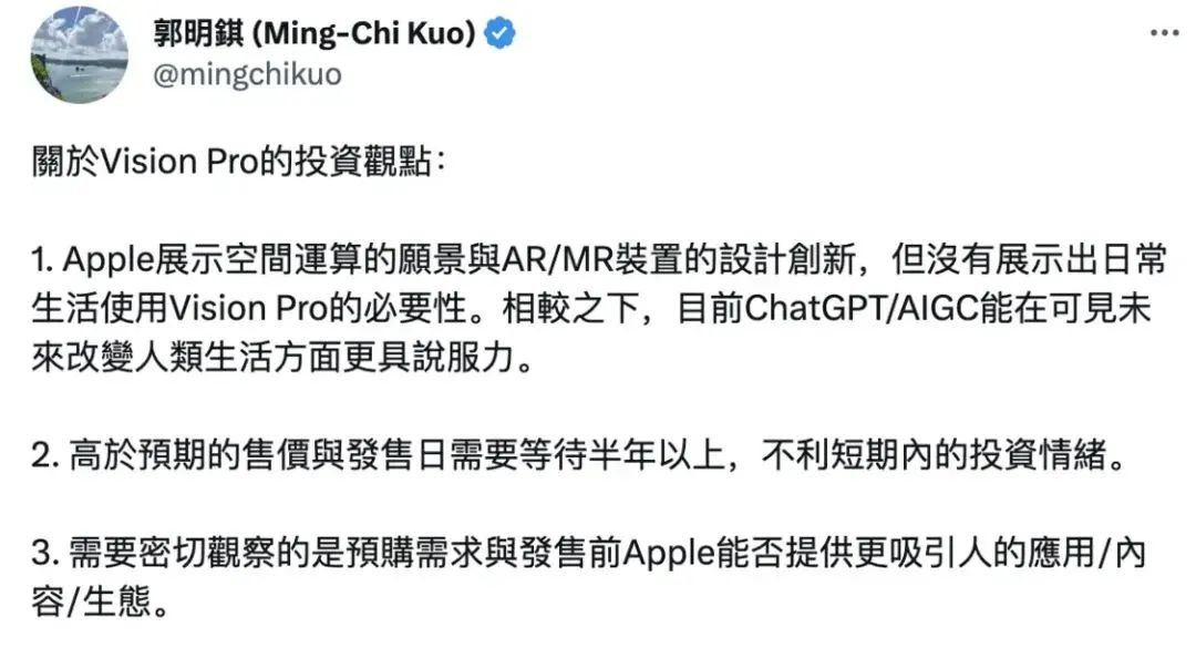 郭明錤周二发布推文称,苹果已经展示了空间计算的愿景与AR/MR装置的设计创新,但没有展示出日常生活使用Vision Pro的必要性。相较之下,目前ChatGPT/AIGC在可见的未来改变人类生活方面更具说服力。高于预期的售价与需要等待半年以上的发售日不利于短期内的投资情绪,需要密切观察的是预购需求与发售前苹果能否提供更吸引人的应用/内容/生态。