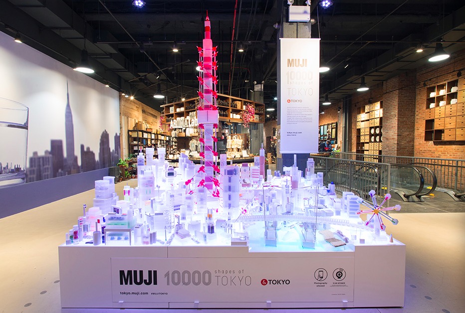 今年5月,MUJI在纽约举办了“东京的一万种形状(10,000 shapes of TOKYO)”展览,用400多种、一万多件MUJI商品搭建出了东京都的模型,在第五大道的旗舰店内展览。除了展示自身商品的多种功能,他们也想让人们对东京旅游和日本文化产生更多兴趣。