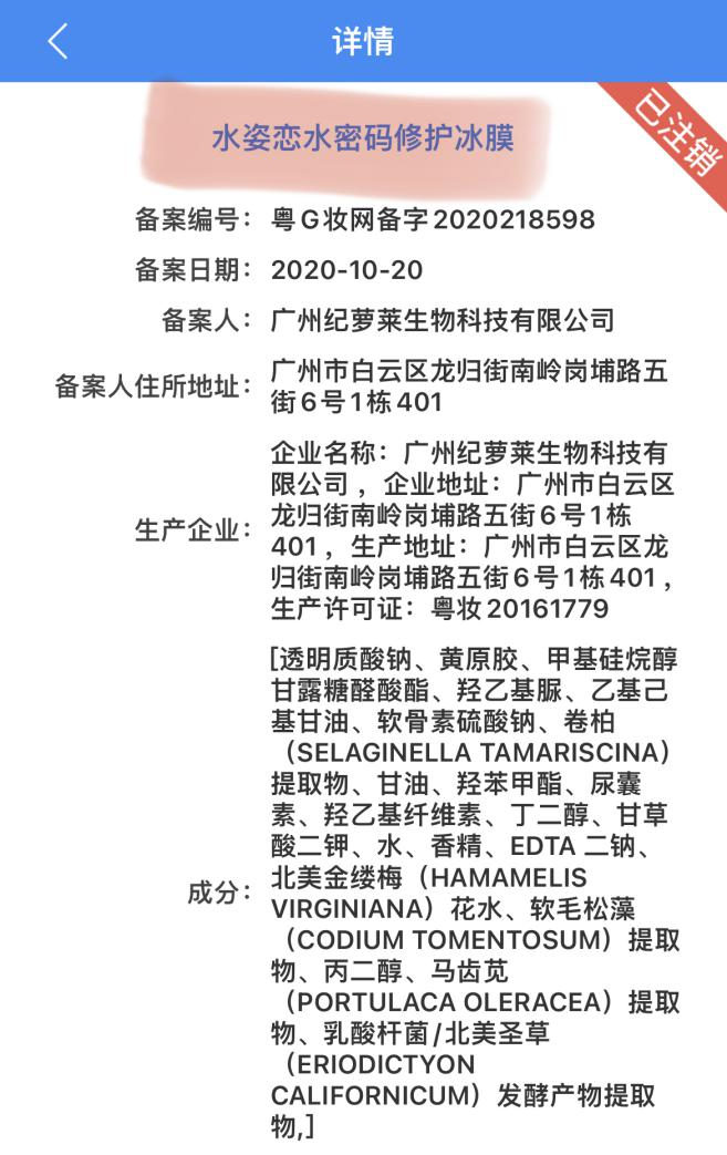 通过查询化妆品监管官网,《化妆品报》了解到,该侵权产品的生产企业,也就是涉事企业为广州纪萝莱生物科技有限公司。公开资料显示,该公司成立于2012年12月,主要经营内容为化妆品、美容服务等。值得关注的是,目前该侵权产品已为注销状态。
