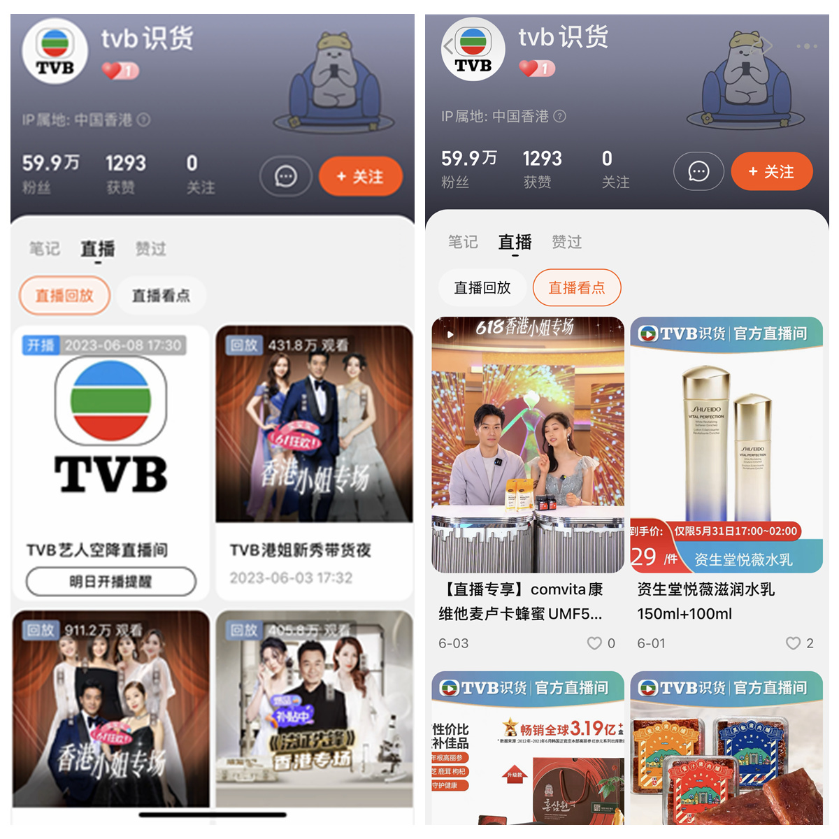 老牌电视台香港TVB也已入局直播电商。2022年4月,TVB在抖音开通了TVB识货(港式甄选)、TVB识货(美味甄选)和TVB识货(香港严选)共3个账号。2023年3月,TVB与淘宝合作的直播带货业务启动,主播包括TVB演员陈豪、陈敏之等,直播时长6个小时,累计观看人数超320万,GMV逾2350万元。