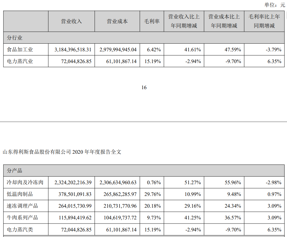 以2020年为例,尽管这一年得利斯的冷却肉及冷冻肉业务实现了23.24亿的营收,但0.76%的毛利率只带来了不足1800万的利润。